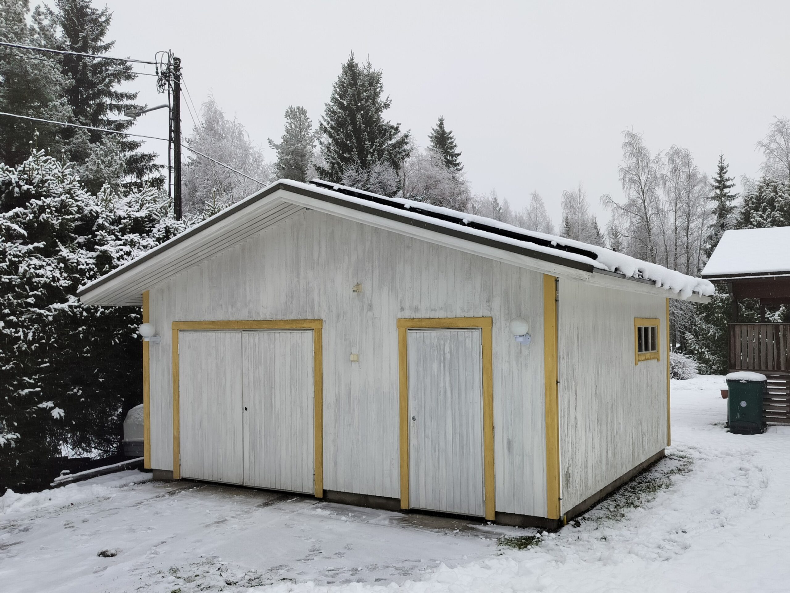 Pienen autotallin vinyyliverhous. Tässä kohteessa voitiin pystyrimotus asentaa suoraan vanhan verhouksen päälle ja siihen kiinnittää vaakaan kermanvärinen vinyyliverhous. Samalla verhoiltiin myös räystäänaluset sekä ns. otsat pellitettiin.