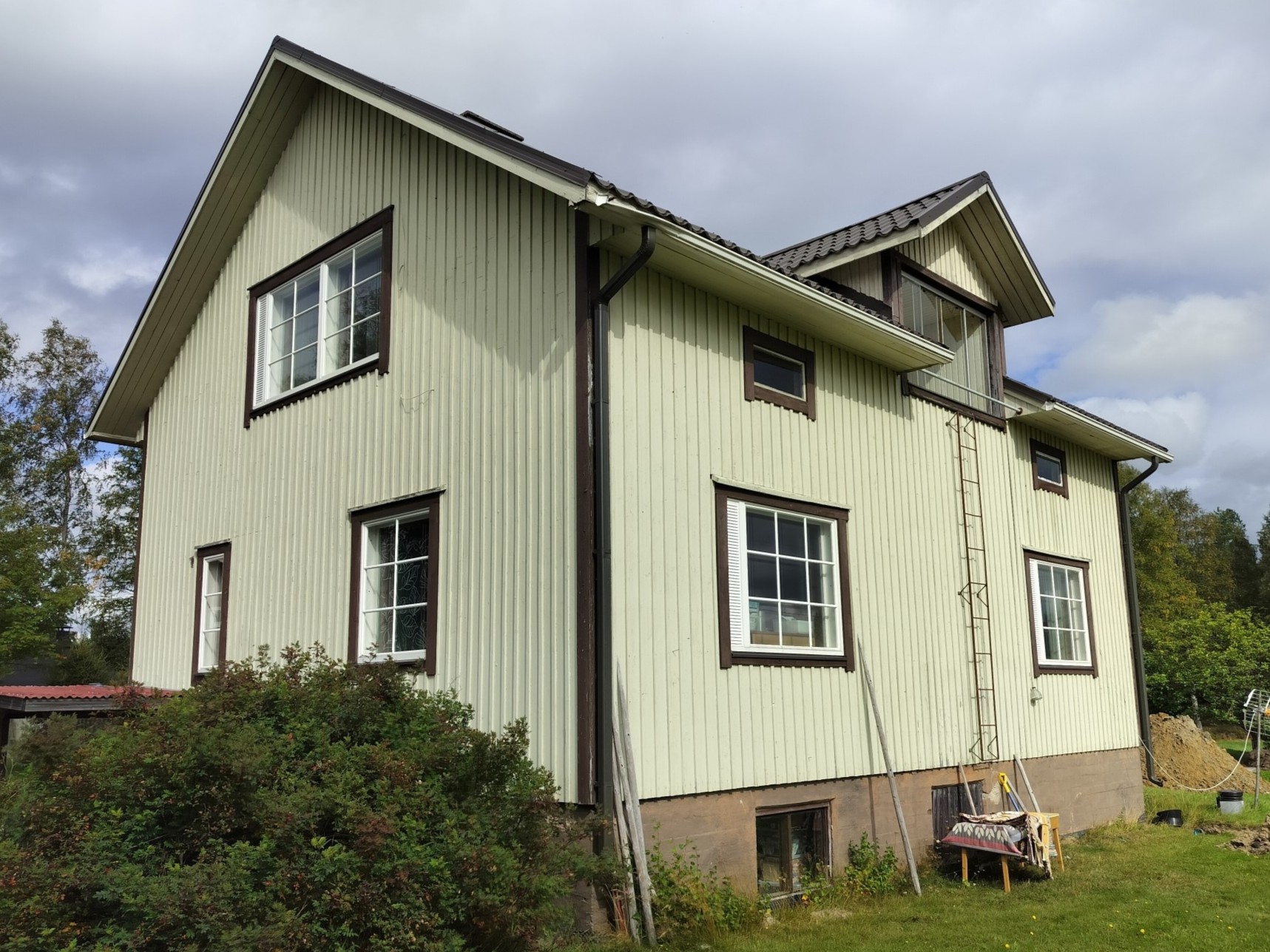 Täällä vaihdettiin ikkunat, uusittiin ulkoverhous kauniilla sinisellä vinyyliverhouksella sekä laitettiin räystäänaluset kuntoon. Eipä tartte sitten...